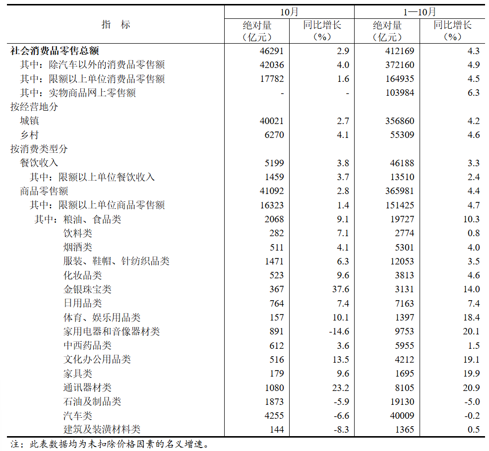 按经营单位所在地分,10月份,城镇消费品零售额40021亿元,同比增长2.7%;乡村消费品零售额6270亿元,增长4.1%。1-10月份,城镇消费品零售额356860亿元,增长4.2%;乡村消费品零售额55309亿元,增长4.6%。