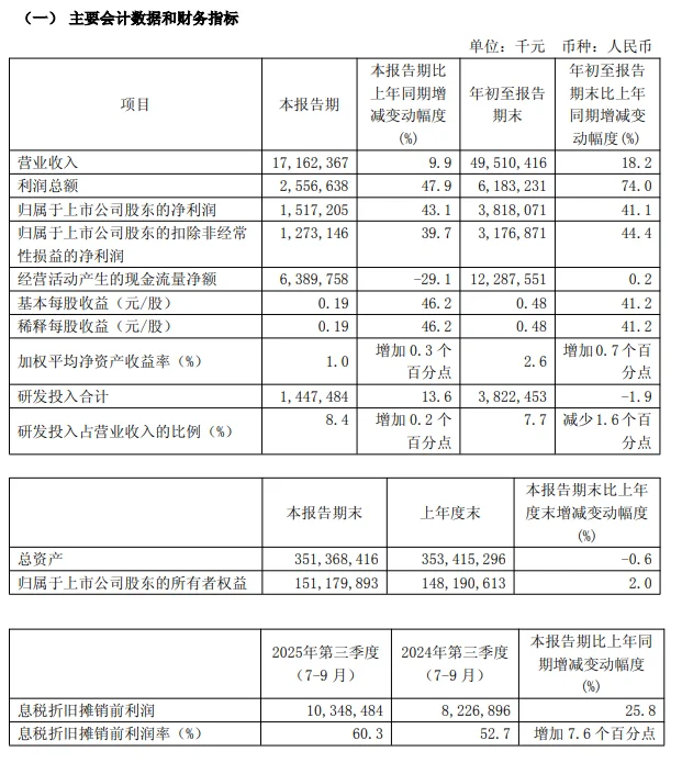 Q3归母净利15.17亿元,同比增43.1%;前三季度归母净利38.18亿元,同比增41.1%;