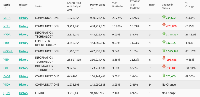此外,被认为由段永平管理的H&H International Investment基金加仓伯克希尔,继续减持苹果;李录掌管的喜马拉雅资本则持股不动,依然重仓持有谷歌和拼多多。