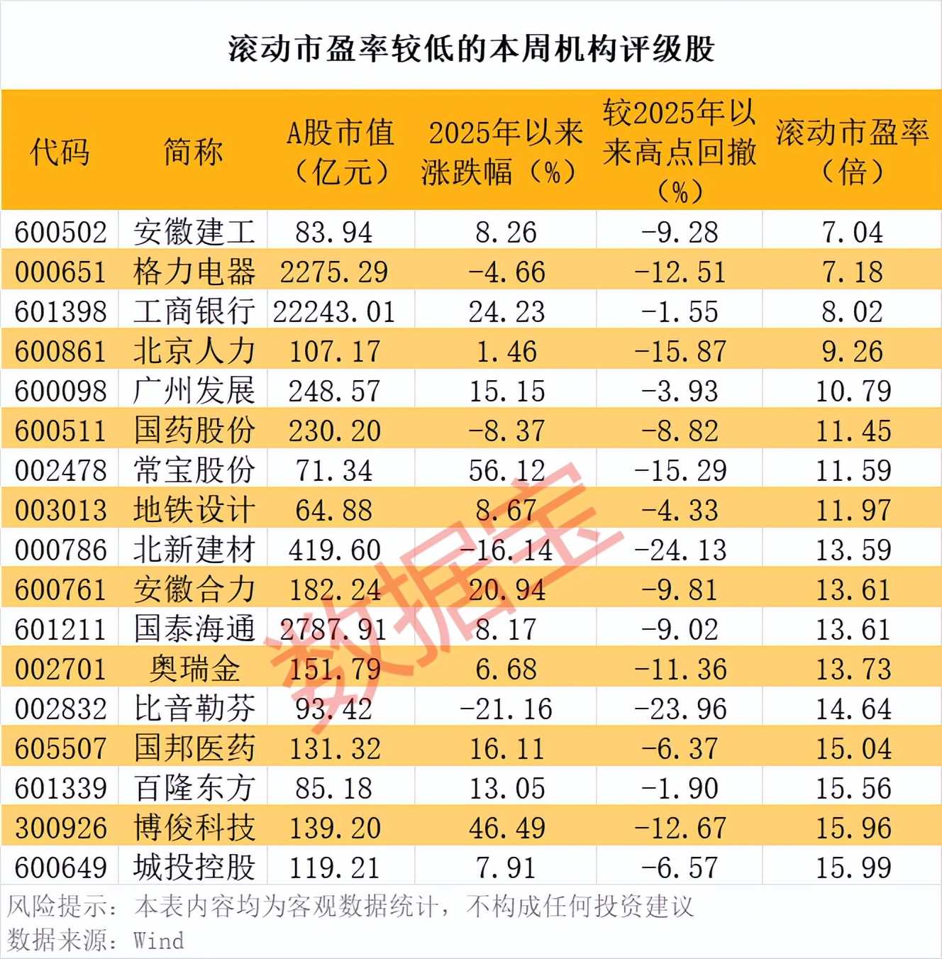 本周获2家机构评级的安徽建工,其滚动市盈率为7.04倍,排在最低位置。11 月13日晚间,安徽建工发布公告称旗下子公司牵头的联合体斩获两项重大项目,合计金额超17亿元。
