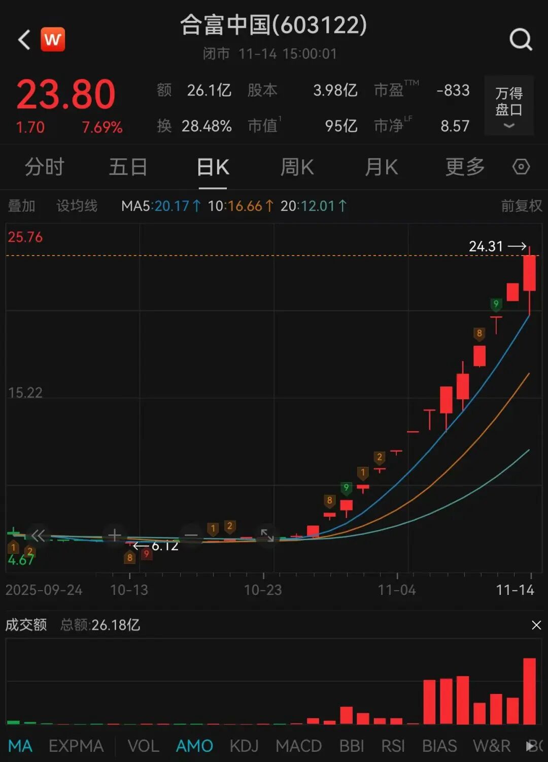 Wind数据显示,11月14日,合富中国股价收盘报23.8元/股,收盘涨幅为7.69%。公告显示,10月28日至11月14日,合富中国股价累计涨幅达256.29%。