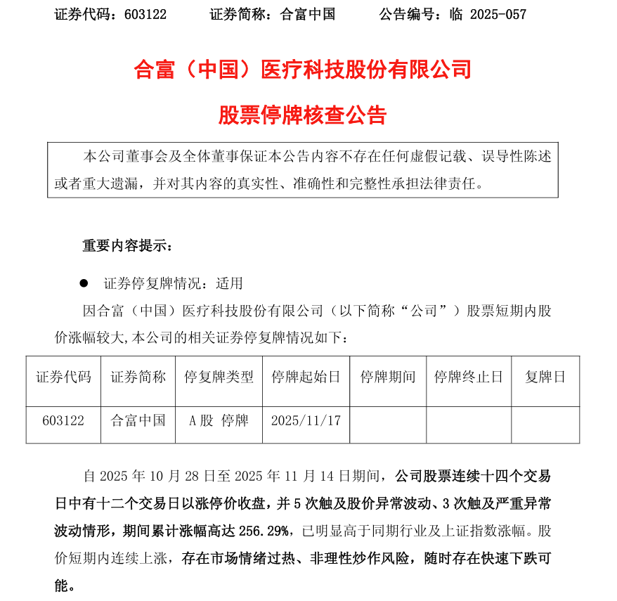 根据公告,10月28日至11月14日,合富中国股票连续14个交易日中,12个交易日以涨停价收盘,并5次触及股价异常波动、3次触及严重异常波动情形,期间累计涨幅高达256.29%,已明显高于同期行业及上证指数涨幅。股价短期内连续上涨,存在市场情绪过热、非理性炒作风险,随时存在快速下跌可能。