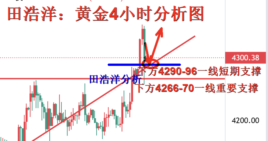 文/田浩洋——专业国际市场点评,针对实际市场参与者,考虑到部分市场窗口对于实盘交易具有一定的时效性可关注笔者,从而能够选择合适的策略进行操作。对黄金有深入的研究,如果你做单不顺或投资经常资金缩水,那么你可以关注田浩洋本人。黄金今天周一开盘表现比较淡定,开盘在4295一线,截止目前最高触及4308一线,周末本人文章就给了4290-96一线做多的策略,大家可以关注本人周末的文章分析,拒绝马后炮,今天我们继续按照周末的分析进行操作,继续以回踩不破继续做多,毕竟多头趋势依旧存在,无论是技术面还是国际消息面,黄金上涨无疑是正确的方向,操作上我们依旧保持回踩不破做多为主,顺势操作,切勿逆势追单,否则都会在扛单熬夜中度过!如果你目前操作不理想,希望田浩洋能让你的投资少走弯路,欢迎前来沟通交流!