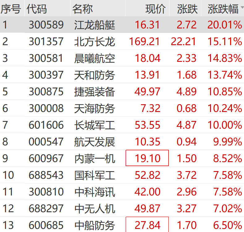 11月17日,军工板块盘初走高,长城军工、航天发展竞价涨停,江龙船艇20cm涨停,北方长龙、晨曦航空等涨超10%。