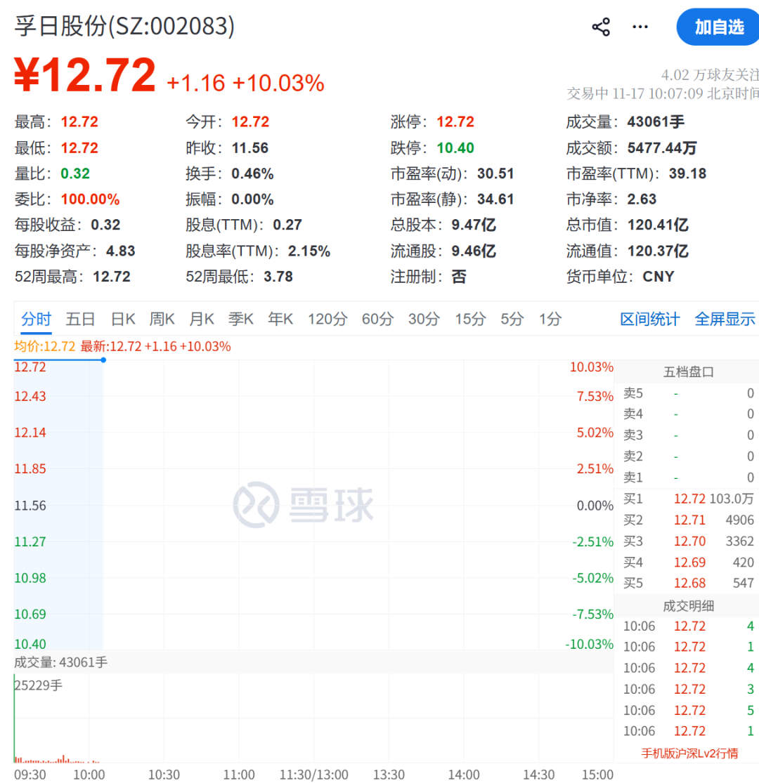 11月17日,孚日股份在集合竞价阶段即封住涨停,成功走出8连板。截至发稿,孚日股份买一达103万手。