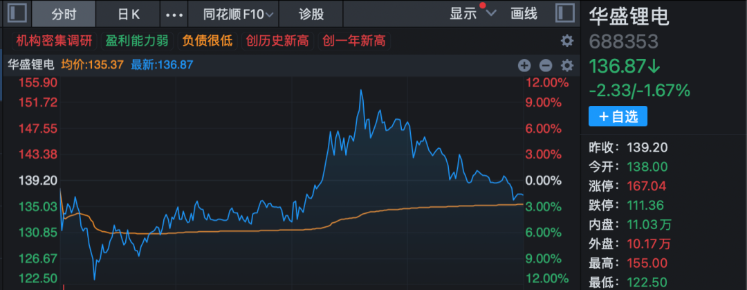 除锂矿和锂电外,另一锂电材料电解液同样冲高。17日午后,锂电池电解液概念震荡回升。早盘一度跌逾10%的华盛锂电(688353)盘中一度反弹涨超10%,续创历史新高。永太科技走出7天4板;科隆股份、清水源、海科新源、石大胜华、新宙邦涨幅靠前。