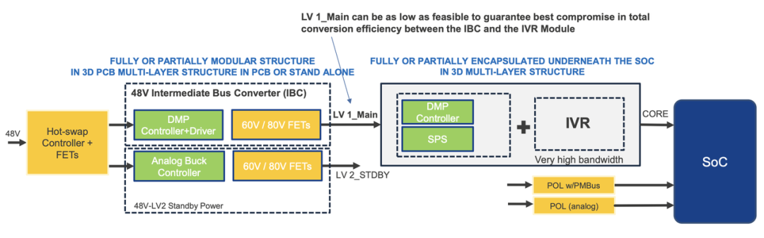 随着IVR下沉到SoC封装下方,其与IBC之间的关系需要重新定义。为了满足IVR的更高工作频率与宽带需求,IBC需提供更高的转换比与更低的纹波,同时尽可能缩小体积以适配紧凑的服务器布局。部分方案甚至采用双级IVR结构,在SoC附近实现最终调压以优化动态性能。