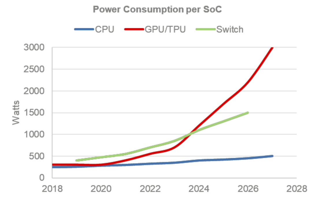 在算力密度方面,GPU与定制化加速器的功耗增长远超CPU,自2018年至今,GPU和TPU的功耗呈指数级增长,而CPU增长较为缓慢,提升了机架功率,也放大了配电网络的损耗压力。