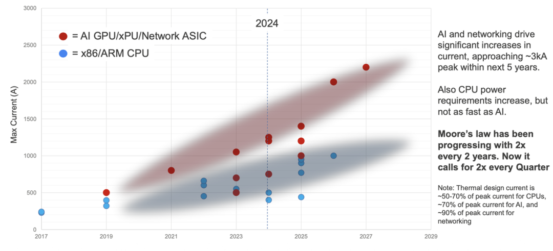 行业预计未来五年AI芯片峰值电流将接近3kA,而CPU的增速虽低但同样持续增加。这样的大电流不仅要求多相VR具备更高的相数与带宽,也推动了垂直配电(VPD)方案的使用。VPD通过缩短供电路径减少PDN阻抗,从而降低损耗并提升响应速度。