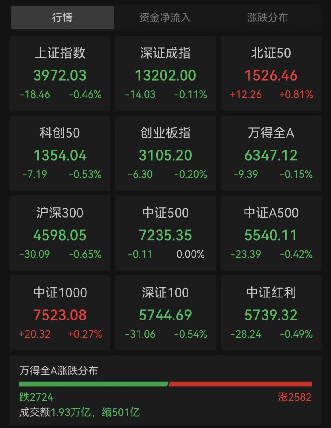 具体来看,沪指盘中窄幅震荡下探,深证成指、创业板指尾盘有所回升。截至收盘,沪指跌0.46%报3972.03点,深证成指跌0.11%报13202点,创业板指跌0.2%报3105.2点,上证50指数跌0.87%,北证50指数涨0.81%,沪深北三市合计成交19305亿元,较此前一日减少约500亿元。