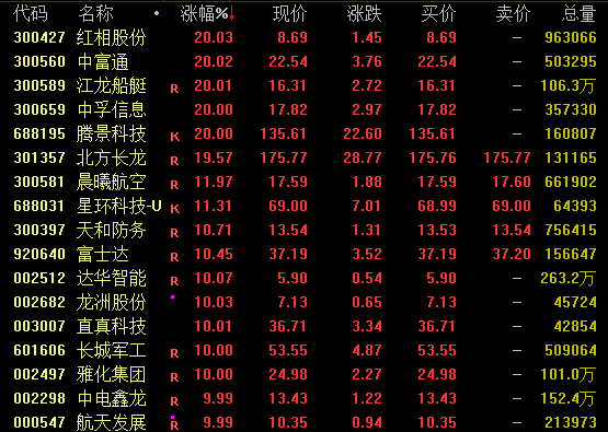 军工板块盘中强势拉升,截至收盘,红相股份、中富通、江龙船艇、腾景科技等20%涨停,北方长龙逼近涨停,长城军工、雅化集团等亦涨停。