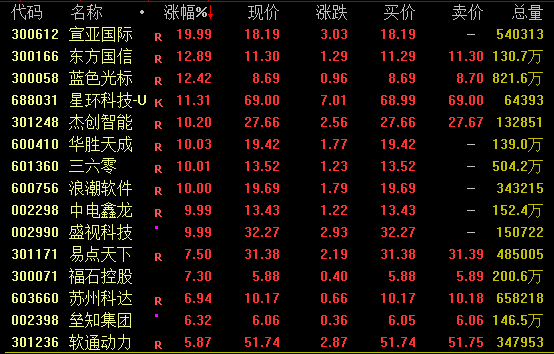 AI应用概念盘中走势活跃,截至收盘,宣亚国际20%涨停,蓝色光标、东方国信涨超12%,星环科技涨逾11%,三六零、浪潮软件等亦涨停。