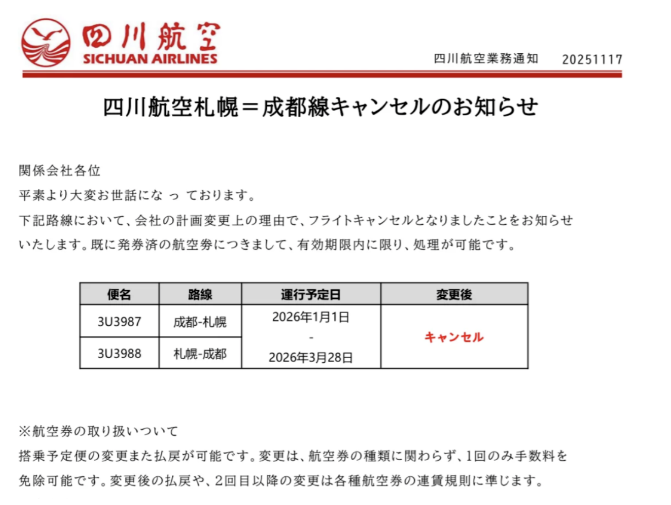 四川航空于17日发布通知,取消2026年1月1日至3月28日的成都至日本札幌航线。