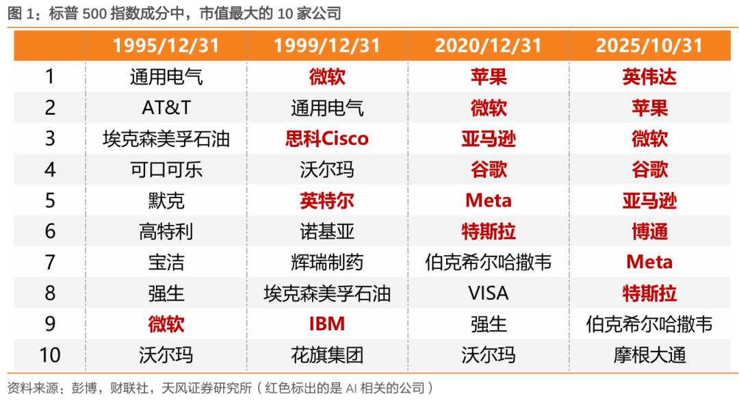 1、创纪录的美股市场集中度。当前美股前8大公司已全被AI公司占据;而互联网泡沫时期,美股前8大公司中互联网公司只占4家。当前,标普500前十大公司市值占比43%,远超2000年互联网泡沫时27%的峰值。