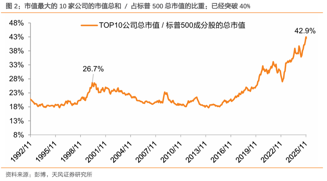 标普500前十大公司的市值占比,在今年加速攀升。截至11月10日,标普500前十大公司占据了该指数总市值的43%,这一比例远超2000年互联网泡沫顶峰时的27%。
