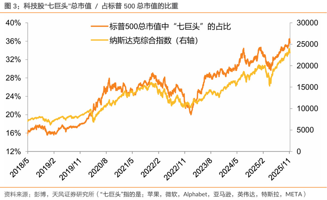 "Magnificent 7"(苹果、微软、谷歌母公司Alphabet、亚马逊、英伟达、Meta和特斯拉),截至11月7日,控制着标普500指数36%的权重、以及纳斯达克综合指数54%的权重。