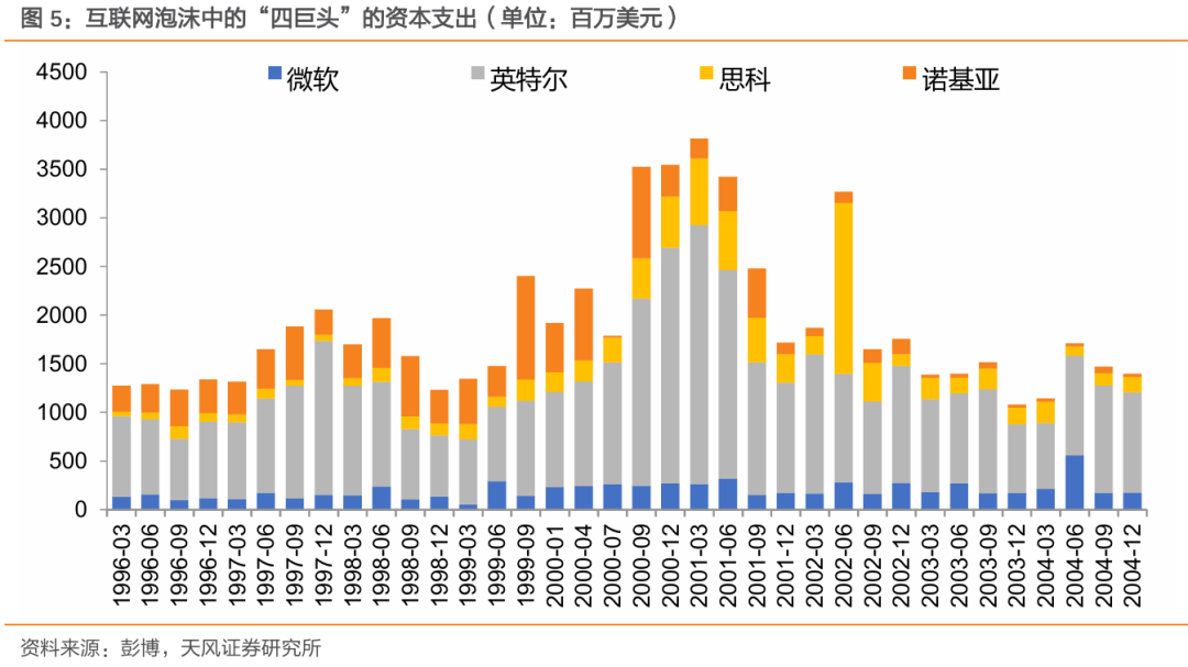 巨头们的资本开支增速,也高于“互联网泡沫”。我们挑选“互联网泡沫”中,市值最高的四家互联网公司:微软、英特尔、思科、诺基亚。在互联网泡沫破裂(2000年3月)之前,互联网“四巨头”的CAPEX当季同比增速最高为55.9%。