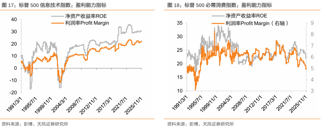 和2000年互联网泡沫破裂之前相比,当前科技股的盈利能力更强。标普500信息技术指数的ROE和利润率均高于1997-1999年的水平;而像必需消费等防御型板块,盈利能力则弱于1997-1999年水平。