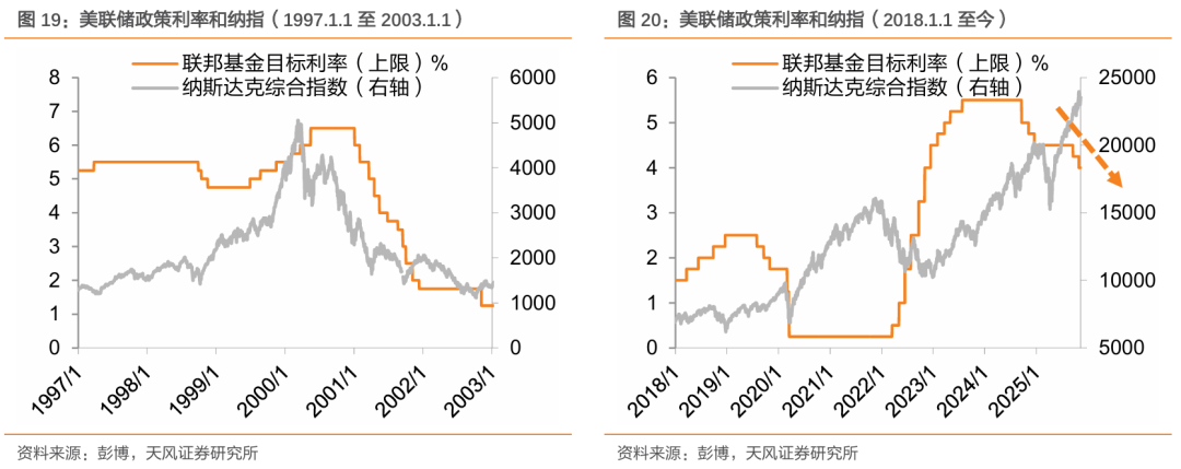 对比当下,预计美联储将在2026年继续降息、甚至可能启动“扩表”以提供流动性。像1999-2000年那样转向加息刺破泡沫的概率不大