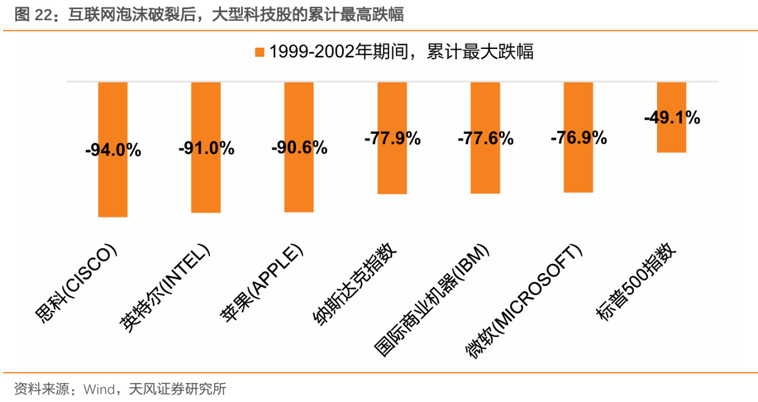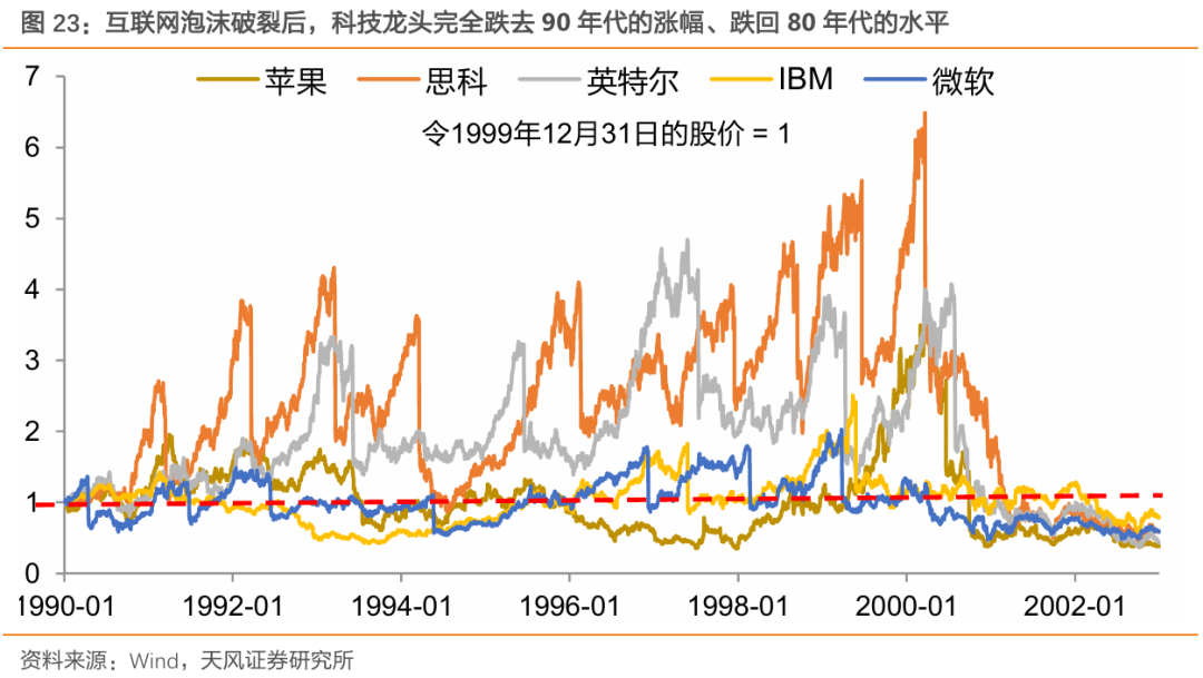 1999-2000年的熊市中,科技龙头损失惨重,思科、英特尔、苹果、IBM、微软分别下跌94.0%、91.0%、90.6%、77.6%、76.9%。科技龙头们完全跌去90年代互联网革命浪潮中积累的涨幅、跌回了80年代的股价水平。