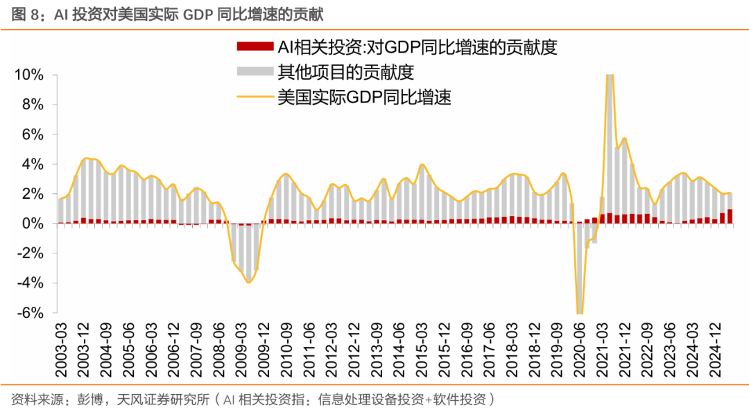 今年二季度,AI投资是GDP增速的重要推动力。第二季度美国实际GDP同比增速2.1%,其中AI投资贡献了1.0个百分点(创历史新高),AI投资以外的项目贡献1.1个百分点。