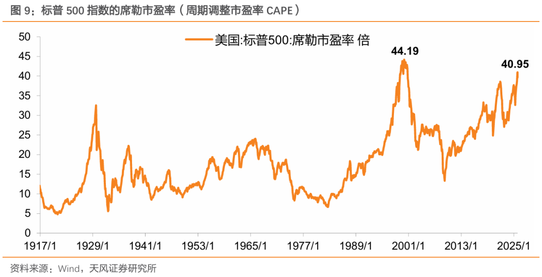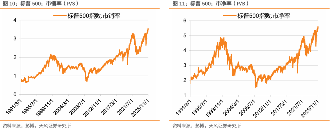标普500席勒市盈率(即周期调整市盈率)在10月底达到40.95倍,历史上最高值为1999年12月的44.19倍。10月底,标普500的市销率(PS)、市净率(PB)均创下历史新高,分别为3.56倍、5.63倍。