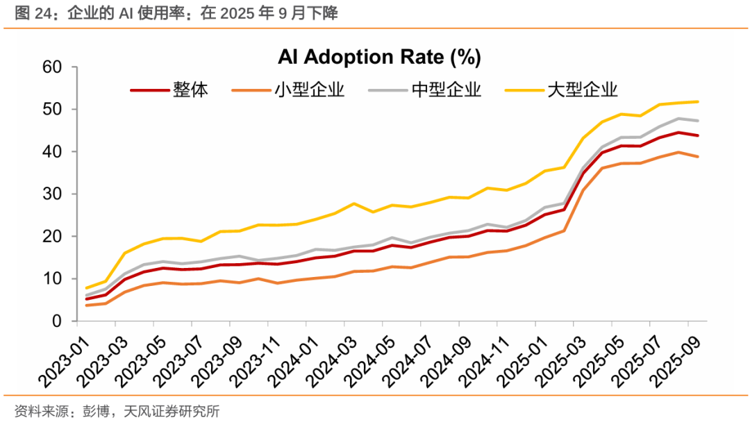 今年9月份,企业总体AI使用率正在下降。Ramp Economics Lab调查数据显示(图24),大型企业的使用率上升、但增长较今年上半年放缓;中型和小型企业的AI使用率下滑;整体使用率从8月的44.5%下降至43.8%。牛津大学的Carl-Benedikt Frey指出:对AI基础设施的大额押注,假设的是使用量将激增,但美国多项调查显示,自夏季以来使用率实际上有所下降,除非新的、持久的用例出现,否则泡沫可能会破裂。