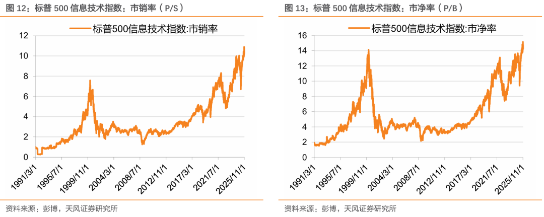 截至11月10日,标普500信息技术指数的市销率、市净率分别为10.53倍、14.63倍,显著高于“互联网泡沫”时期的峰值。