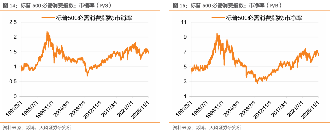 而标普500必需消费指数的市销率、市净率分别为1.47倍、6.58倍,估值水平低于“互联网泡沫”时期,当时分别曾达到2.17倍、9.49倍。