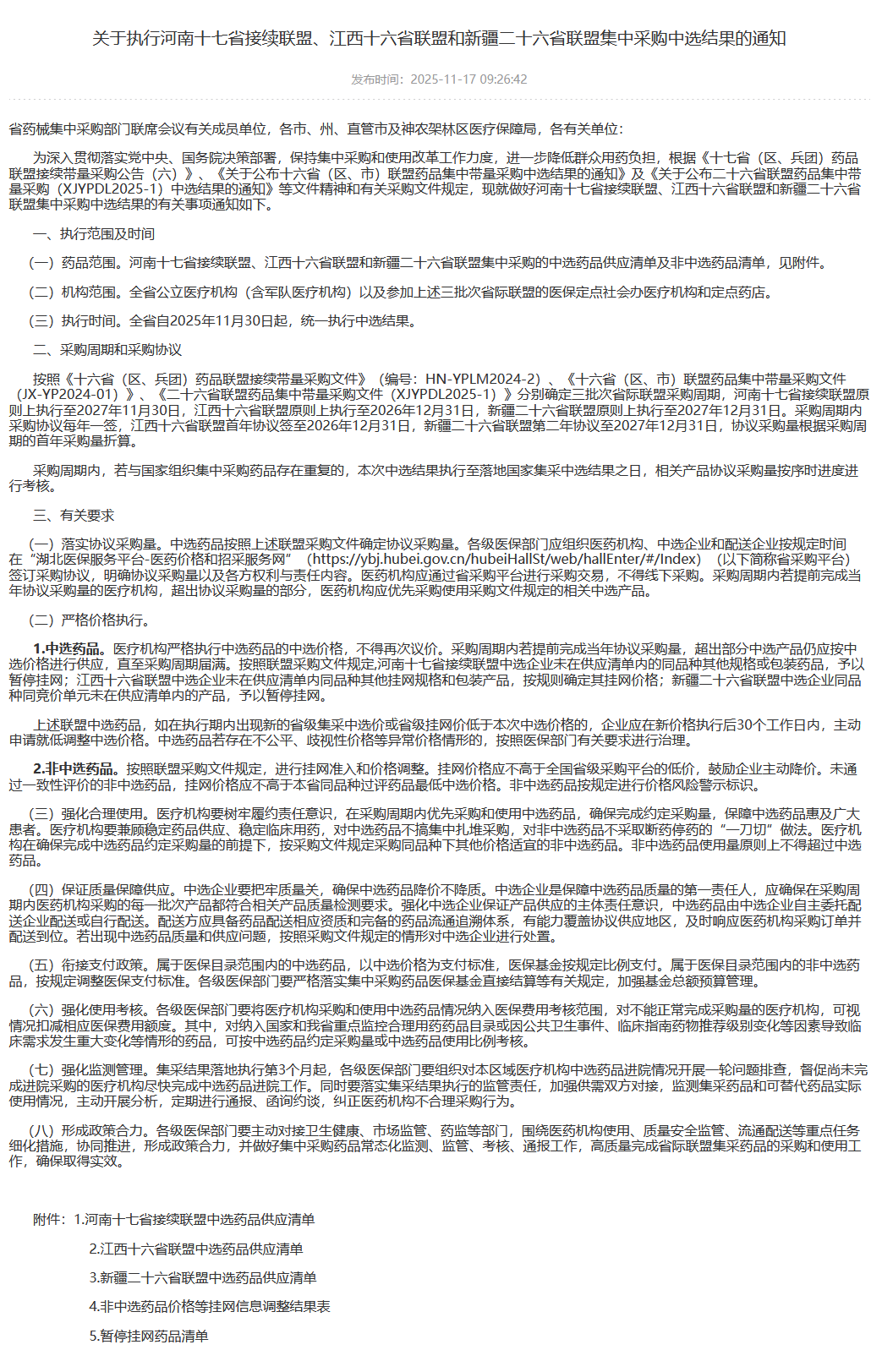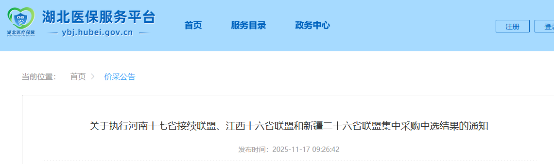 2025年11月17日,湖北省医保局正式发布通知,宣布自11月30日起同步执行河南十七省接续联盟、江西十六省联盟和新疆二十六省联盟的药品集采中选结果。
