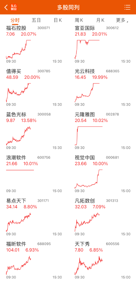 AI应用方向早盘延续强势,其中AIGC概念股集体大涨,宣亚国际收获20cm两连板,福石控股、值得买、光云科技均20cm涨停,视觉中国、元隆雅图、浪潮软件亦封板,蓝色光标涨超13%,易点天下、福昕软件、天下秀等多股跟涨。