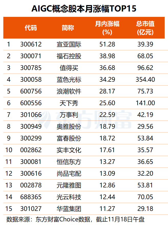 本月以来,多只概念股股价显著上涨,宣亚国际、福石控股、值得买位居前三,月内涨幅分别为51.28%、38.98%和36.68%。