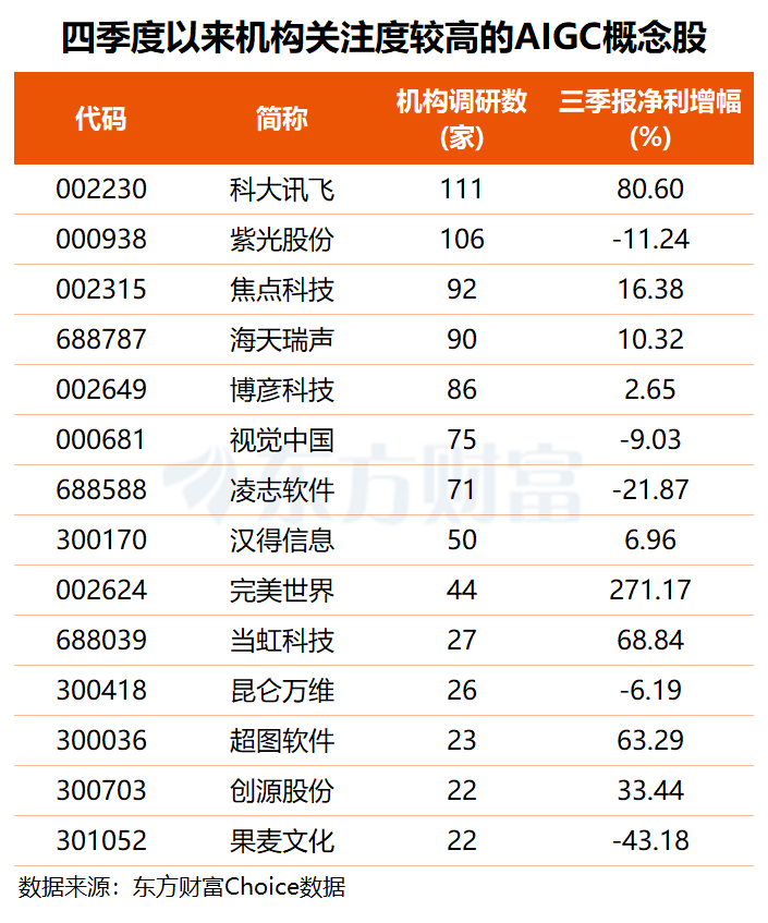 机构调研方面,进入四季度以来,共有23只AIGC概念股获得机构调研,其中科大讯飞、紫光股份的机构关注度最高,10月以来均获逾百家机构集中调研。焦点科技、海天瑞声、博彦科技、视觉中国、凌志软件等个股的机构调研数也都超50家。