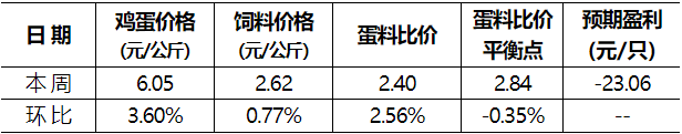 本周全国蛋料比价为2.40,环比上涨2.56%。按目前价格及成本推算,未来蛋鸡养殖每只亏损23.06元。周内鸡蛋供应稳定,因蛋价处于偏低水平,市场整体流通顺畅,蛋价小幅上涨。