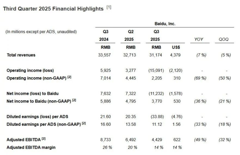 11月18日,百度发布的最新财报显示,2025年第三季度营收311.74亿元(人民币,下同),同比减少7%。归属公司净亏损112.32亿元,上年同期净利润76.32亿元。