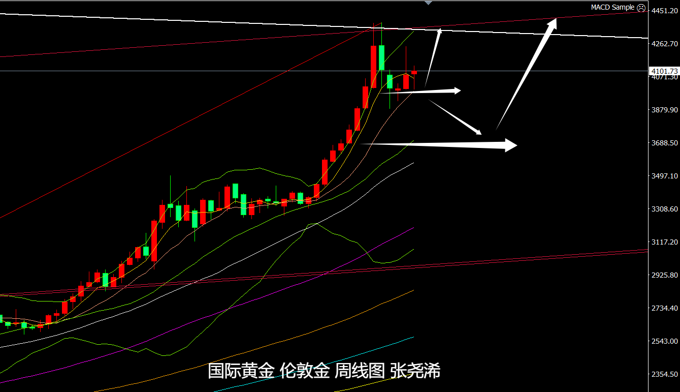 那么,要么等待再度回踩周图中轨线支撑附近(目前是3800美元下方)再度看涨攀升,要么等到12月底或者是明年1月调整周期结束再度看涨攀升。在此之前,可以适当逢低埋伏。
