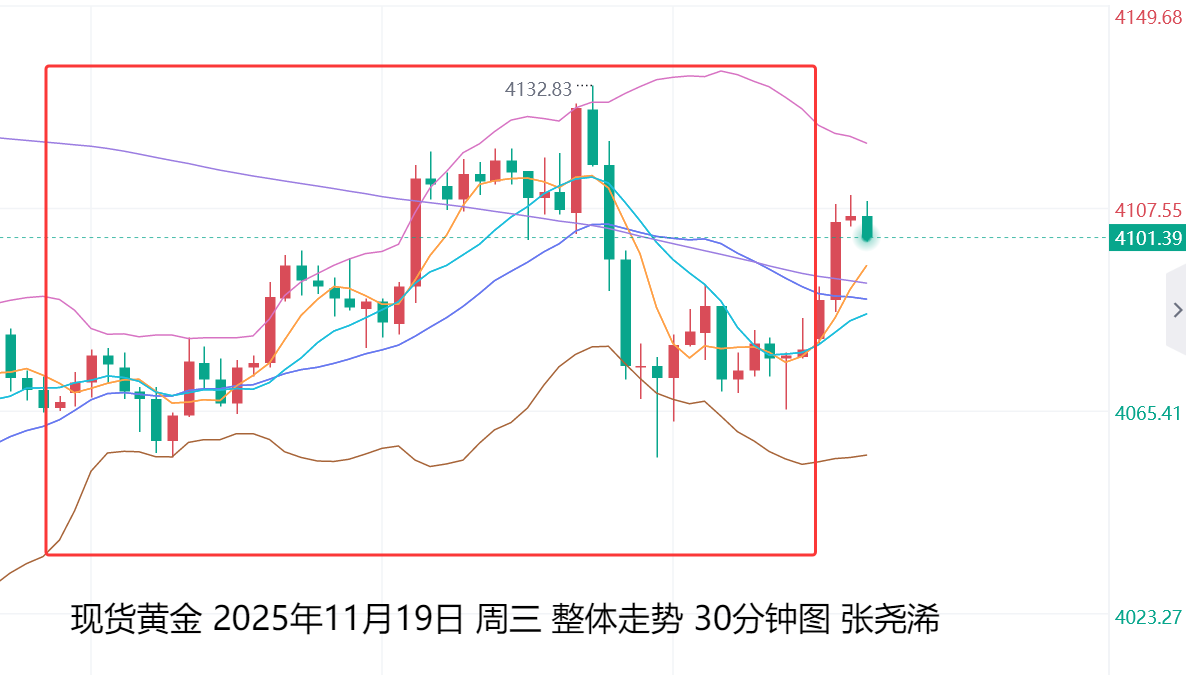 目前市场预期整体数据将利空金价,并且之后公布的美国11月费城联储制造业指数和美国10月成屋销售总数年化(万户)等数据也利空金价,故此,仍需留意美盘的回落走低风险。但预计9月数据已是过去式因素,政府停摆影响的10月和11月数据仍令市场担忧,故此,预计也是先跌后反弹,震荡波动为主,下方关注布林带中轨以及60日均线的触及,也仍是入场看涨的机会。