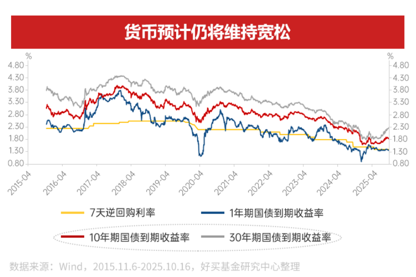 货币政策方面,预计2026年仍将延续“易松难紧”的基调。回顾2025年,一季度受政府债集中发行、汇率波动及资金空转等因素影响,银行间流动性整体偏紧;二季度起央行通过降准降息等操作边际放松,流动性环境逐步改善。进入下半年,“反内卷”政策推升通胀预期,叠加股债市场资金轮动,带动长端利率上行。展望2026年,在“扩内需”政策导向下,流动性环境有望保持合理充裕,为实体经济修复提供支持。