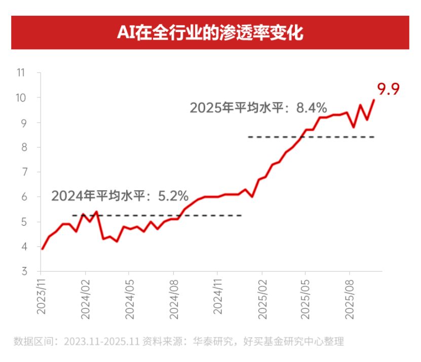 看人类历史上前三次科技革命,科技成果最终的渗透率都接近100%。而被定义为第四次科技革命的AI,当前的应用渗透率仅10%左右。