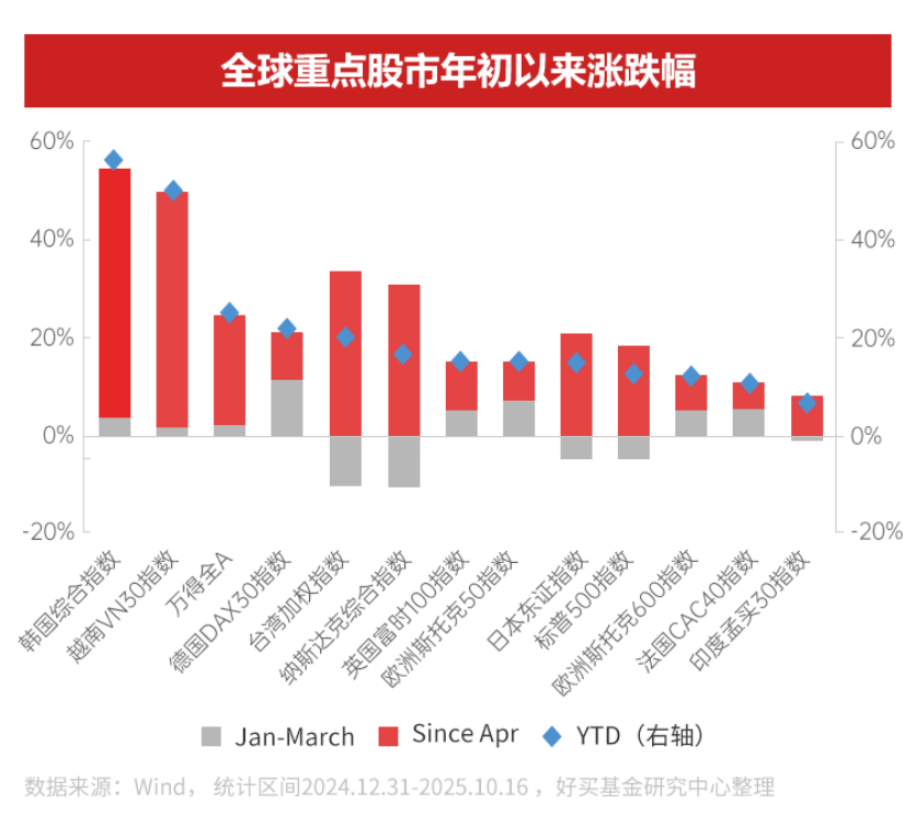 年初以来,全球主要股票市场普遍呈现上涨趋势。按关税时点分开来看,实际关税政策与市场预期差异(即"关税预期差")差越大的市场,反弹幅度相对更大。