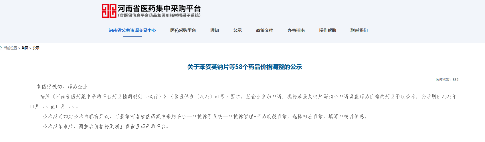 河南省医保局发布公告:苯妥英钠片等58种药品价格即将调整,所有价格变动将在3天公示期后正式落地,涉及全省所有医疗机构和药品企业。