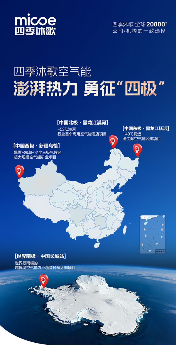 而这些只是四季沐歌“勇征四极”的一个缩影。凭借硬核技术与系统可靠性,四季沐歌空气能已覆盖中国乃至全球最具挑战性的地理坐标,从神州边陲到地球尽头,“四极”不仅是地理概念,更是对产品极限性能的终极验证场。而四季沐歌,正以扎实的技术底座,一次次将“不可能”变为“已运行”。