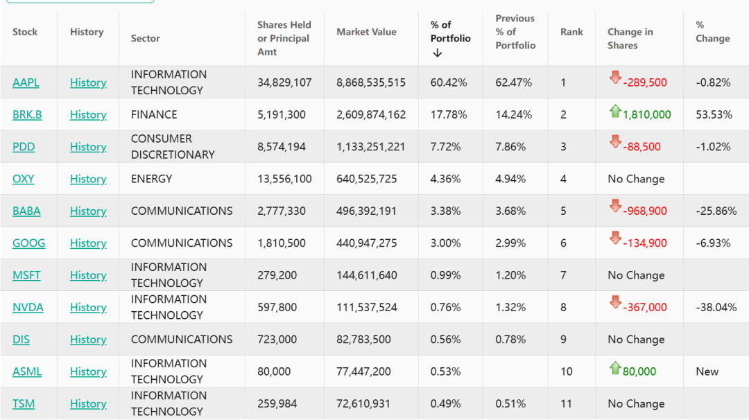 根据13F文件,从整体持仓情况看,H&H International Investment共持有11家公司,包括苹果、伯克希尔·哈撒韦、拼多多、西方石油、微软、迪士尼、台积电、英伟达等。