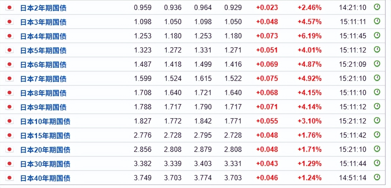 日本国债跌疯了。刚刚,日本各期限国债收益率皆出现暴涨行情,40年和10年期限均创下阶段历史。