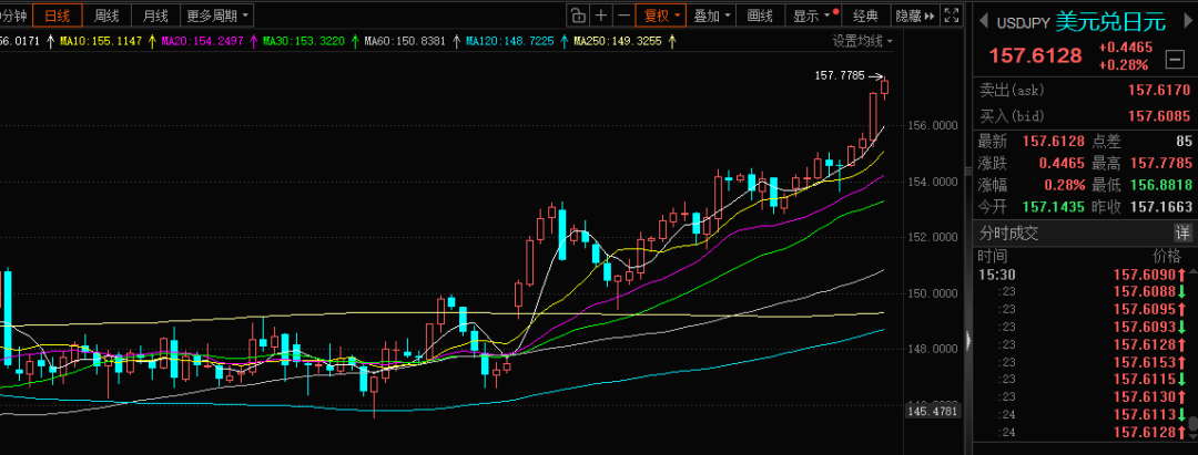 与此同时,日元继续大跌。美元兑日元达到了157.47高位。