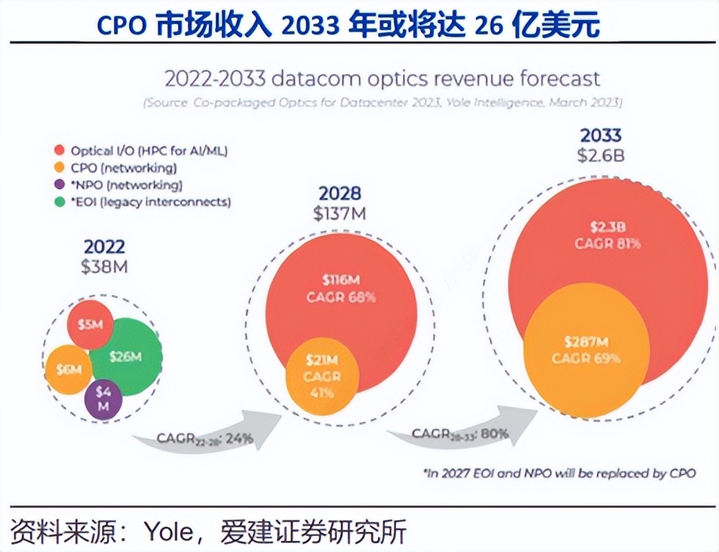 LightCounting和Yole数据认为,CPO将从800G/1.6T端口起步,2024~2025年进入商用阶段,2027年全球端口销量或达450万片,2033年市场收入有望达26亿美元(2022~2033年CAGR为46%)。