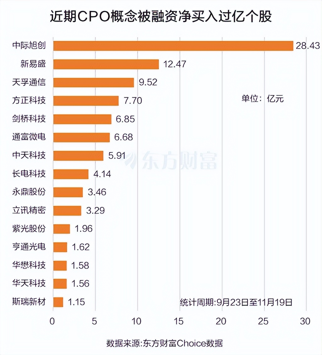 从杠杆资金角度来看,CPO概念指数震荡回调期间,融资客仍呈抢筹之势,期间合计融资净买入(将个股融资净买入额相加所得)超50亿元。其中15股被融资净买入过亿,中际旭创排在首位,被融资净买入28.43亿元。新易盛紧随其后,被融资净买入12.47亿元。天孚通信、方正科技、剑桥科技也被融资净买入居前。