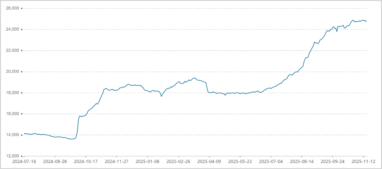 美联储首次降息后,2024年还降息了两次,累计50BP。经过一段平稳期,今年9月恢复降息,10月再度降息。可见,联储降息大势不可阻挡。这也意味着包括A股在内的全球风险资产在未来较长时间内都趋于上行。