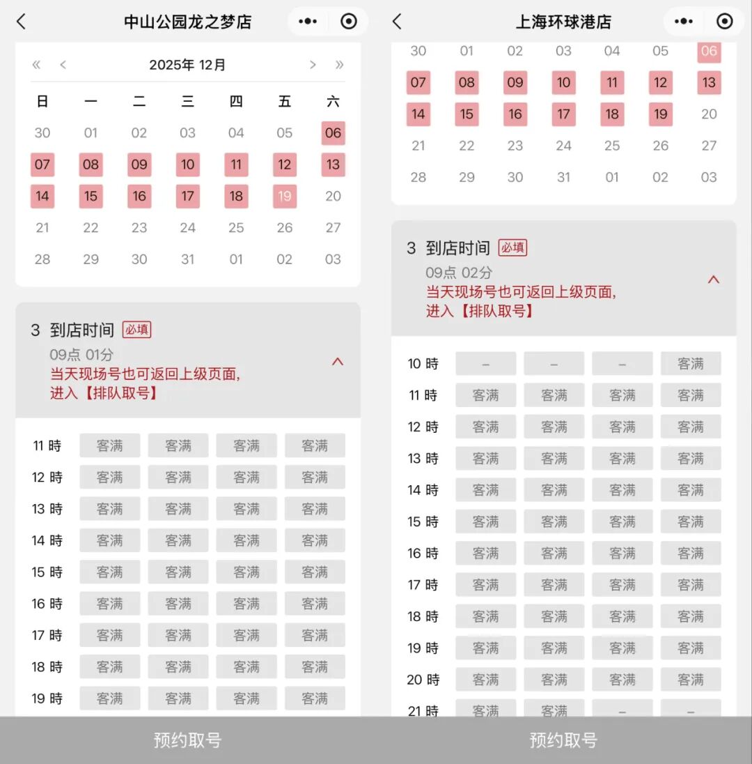 寿司郎小程序显示,其在上海的“双首店”中山公园龙之梦店、上海环球港店将于12月6日同步开业,11月7日开放预约取号。截至11月20日,这两家门店在12月6日-19日所有营业时段均显示“客满”。