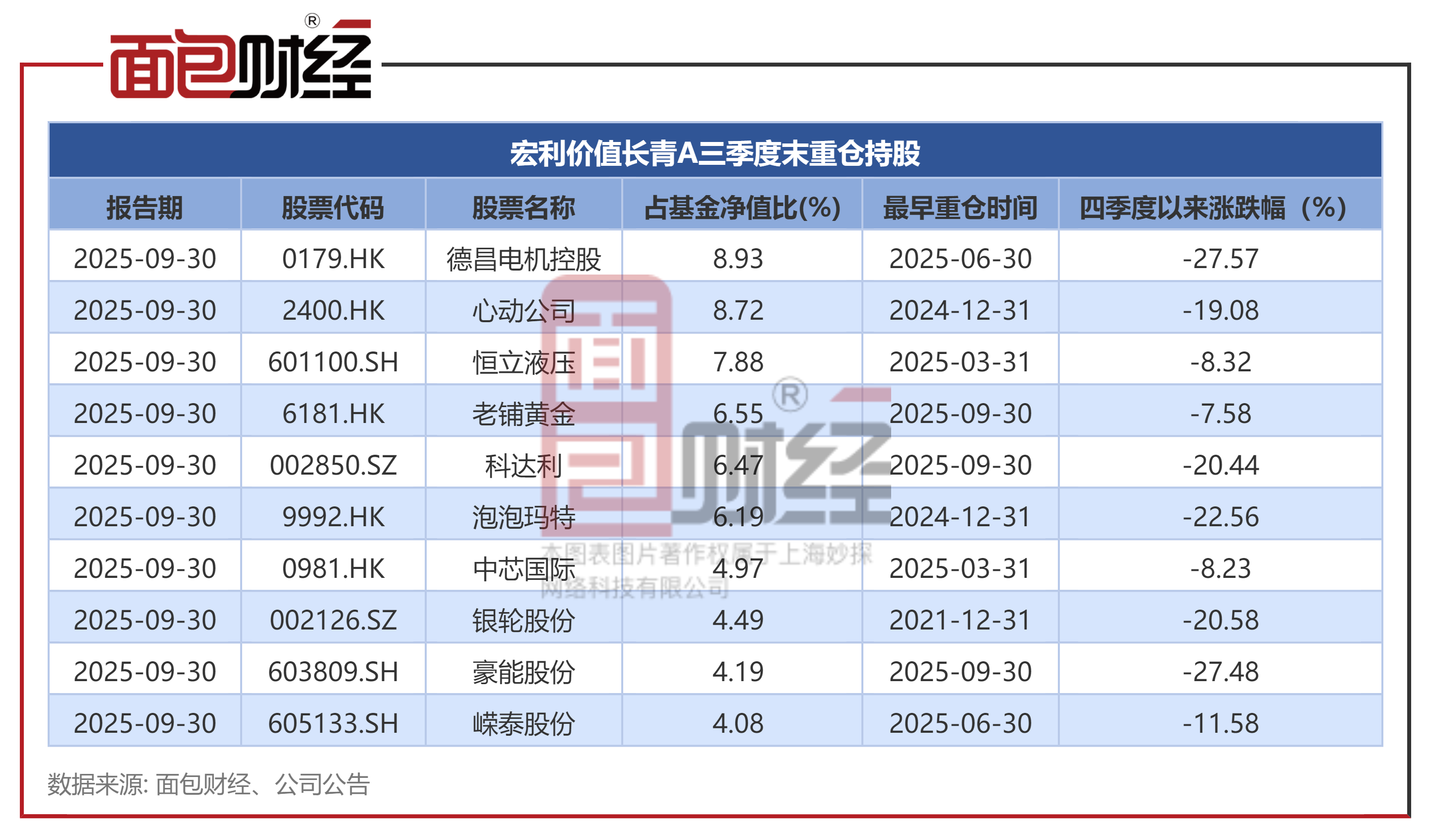 研究基金持仓, 2025年三季度末,宏利价值长青重仓TMT和新消费等板块,前十大重仓股中包括德昌电机控股、心动公司、泡泡玛特等。其中,老铺黄金、科达利、豪能股份等为三季度新晋重仓股。